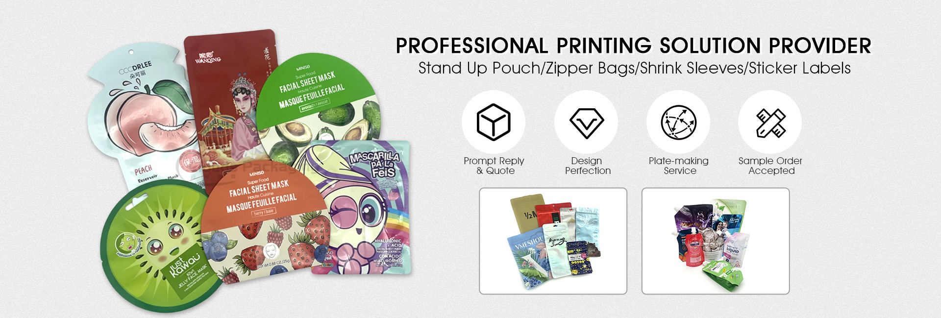 Productos principales:Bolsas Mylar, mangas retráctiles, bolsas de pie, bolsas con cierre de cremallera, etiquetas adhesivas